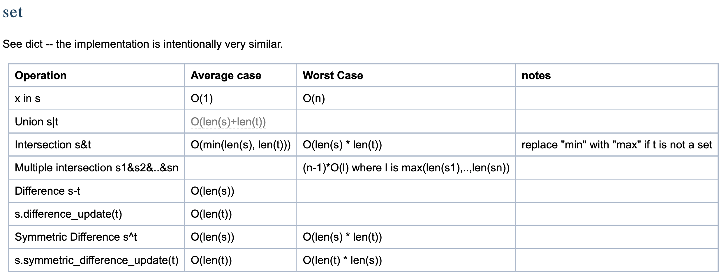 교집합 연산 -> O(min(len(s), len(t))). 다만 최악의 경우 O(len(s) * len(t)) 가 될 수 있음.