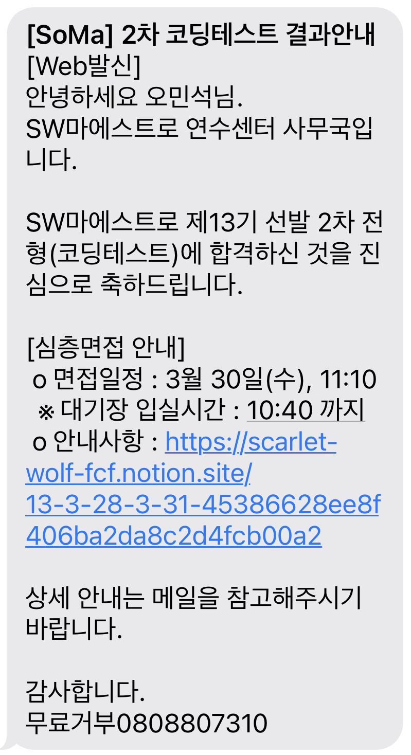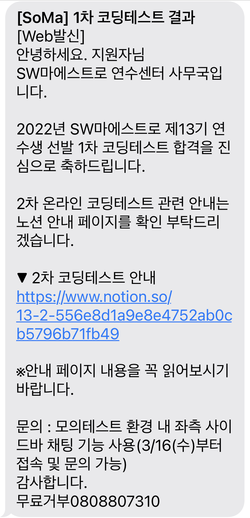 1차 코딩테스트 결과는 합격이었다! 풀었던 알고리즘과 SQL이 모두 맞은 것 같다. 이전 기수 코딩테스트부터 SQL과 WEB 문제의 점수 비중이 크다는 것은 들었지만, 떨어질 것 같았는데 다시 기회를 받으니 너무 기뻤다.