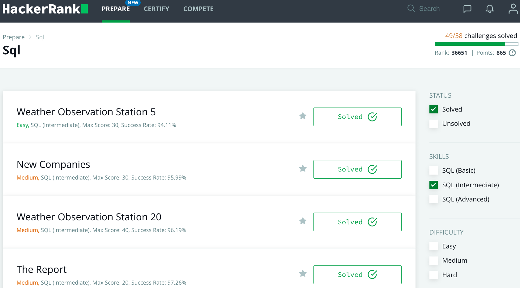 SQL은 HackerRank의 SQL 문제들을 풀었고, 난이도는 Intermediate까지 풀었다. 이는 서브 쿼리, 다중 JOIN 정도에 해당하는 난이도다.