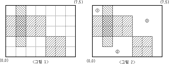 예를 들어 M=5, N=7 인 모눈종이 위에 <그림 1>과 같이 직사각형 3개를 그렸다면, 그 나머지 영역은 <그림 2>와 같이 3개의 분리된 영역으로 나누어지게 된다.