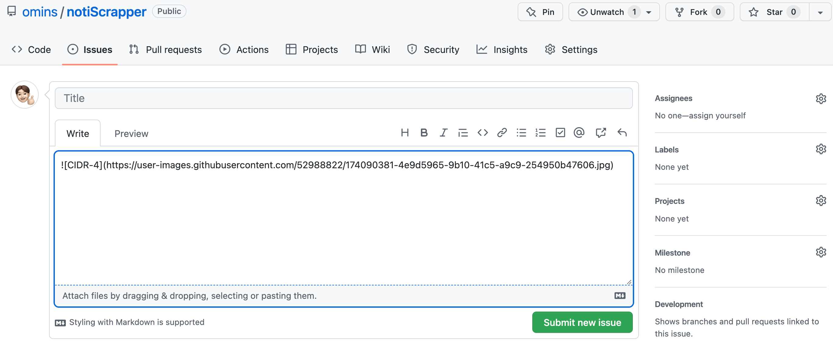 2. New issue를 누르고, README에 삽입하고 싶은 이미지를 드래그 & 드롭 한다.