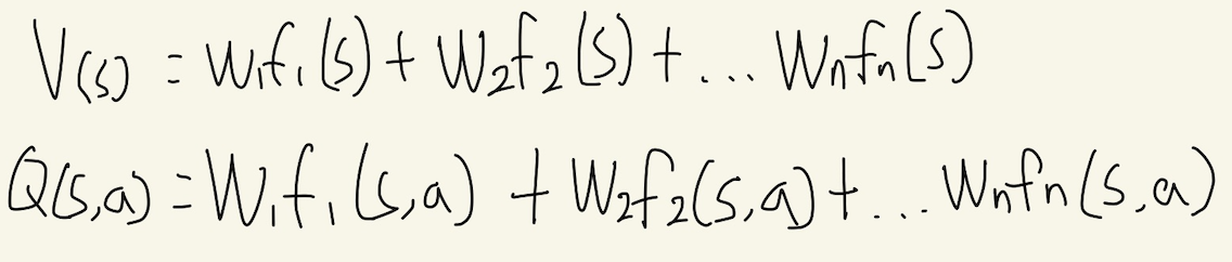 그렇다면 dTg와 dTf에 대한 가중치는 활용하여 어떻게 Q(s,a)와 V(s)를 도출할 수 있을까? 바로 'Linear Value Function'을 통해 도출할 수 있다.